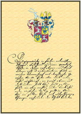 "Daß gegenwärtig in Farben entworfene Wappen, Bestehend aus einem quartiertem Schilde, in deßen erstoberen und viertunteren roth oder rubinfarbene Felde ein weißer Thannenhirsch mit ungleichen Geweyhen von 10 Enden, oben links, unten rechts aufspringt, im zweytoberen und drittunteren halb blau, halb gelben Felde ein oben rechts, unten links schauender einfacher Adler gelb im blauen, blau im gelben Teile mit ausgethanenen Schwingen erscheint, den Schild bedecken zwey offene einwärts gekehrte, rechts mit weiß und rot, links mit weiß und blau abhangenden Decken denn Kleinod gezierter Turnierhelm, wo aus der Krone des ersten der weiße Tannenhirsch mit Geweyhen links bis am unter Leib aufsteiget, aus innen des zweiten aber der einfache Adler oben gelb, unten blau mit aufgethanenen Schwingen bis am Unterlaib rechts schauend emporraget. Von mir nach denen Regeln der Heraldie also gebildet und heraldisch beschrieben worden, auch dem Impetranten ohne jemandes Praediz mitgeteilt werden könne. Auch solcher wird unter Aufdruckung des churfürstlichen Hof- und landesheraldischen Expeditionsamt Insiegels, dann meiner Handunterschrift attestiert.